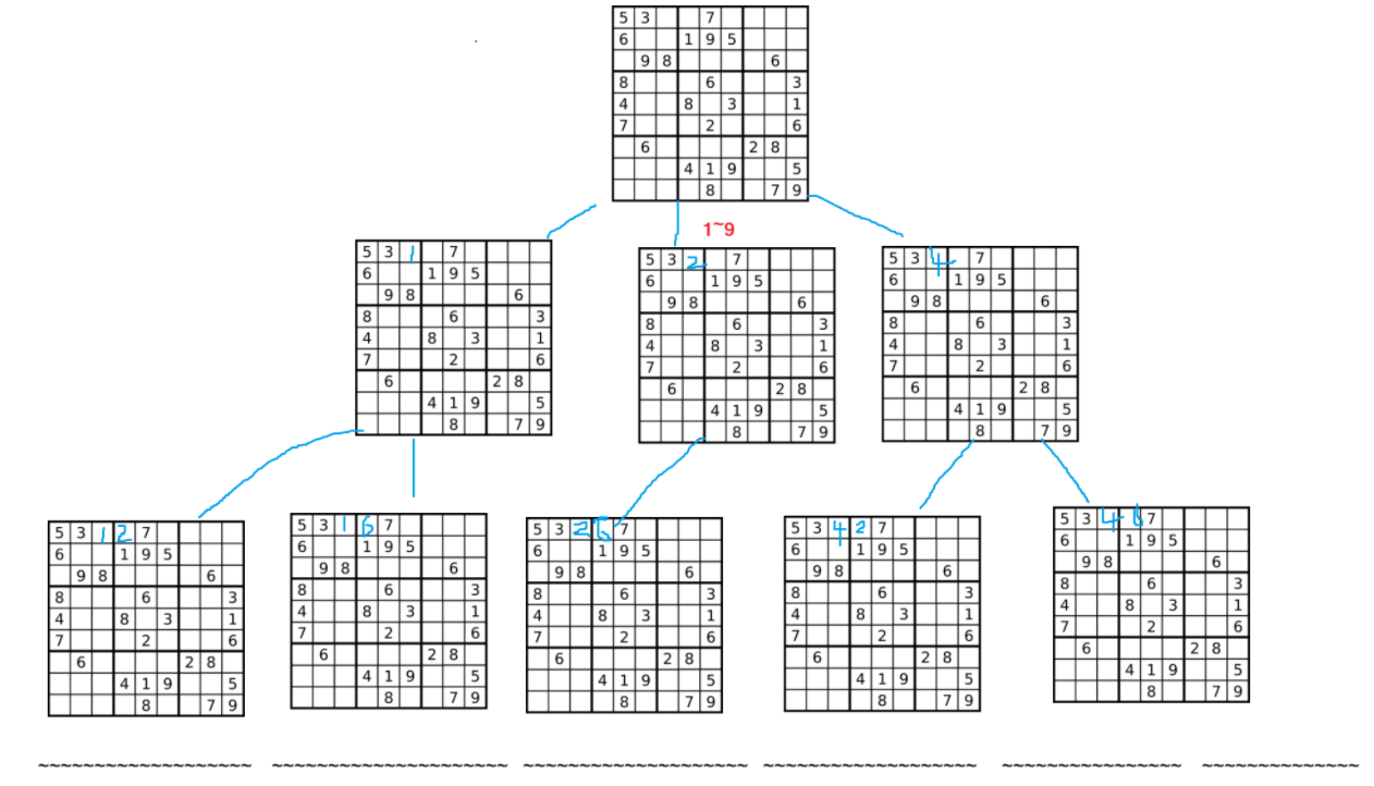 解数独需要填充所有空格,且每一步都要满足数独规则。这类 “尝试所有可能并回溯” 的问题,最适合用深度优先搜索(DFS)+ 回溯来解决。