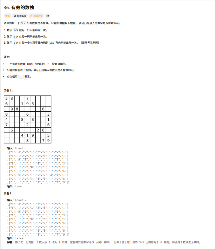 - 有效的数独:验证已填入的数字是否符合规则(无需保证数独可解);