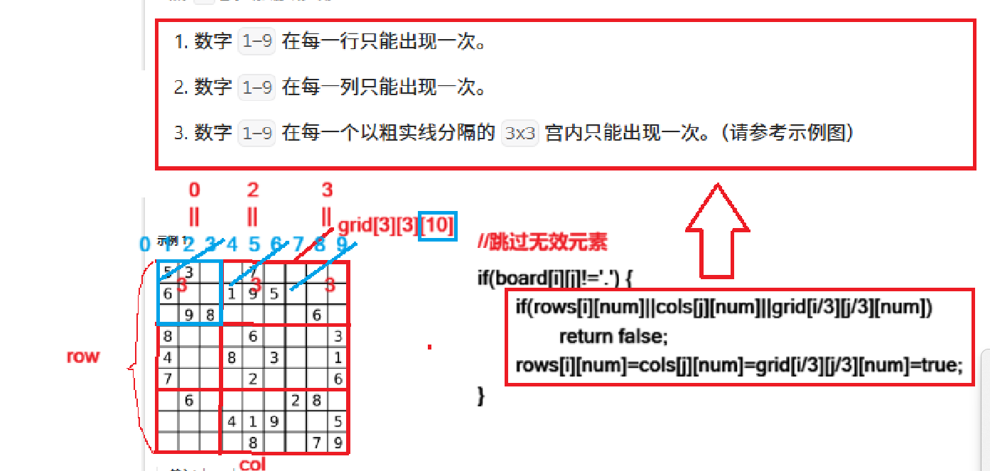 public:bool isValidSudoku(vector<vector<char>>& board) {// 三个数组分别记录:行、列、3×3子网格的数字出现情况bool rows[9][10] = {false}; // rows[i][num]:第i行是否出现过numbool cols[9][10] = {false}; // cols[j][num]:第j列是否出现过numbool grid[3][3][10] = {false};// grid[x][y][num]:第(x,y)个3×3子网格是否出现过numfor (int i = 0; i < 9; ++i) {for (int j = 0; j < 9; ++j) {if (board[i][j] == '.') continue; // 空格跳过int num = board[i][j] - '0';// 若行、列或子网格中已出现该数字,直接返回无效if (rows[i][num] || cols[j][num] || grid[i/3][j/3][num]) {return false;}// 标记该数字已出现rows[i][num] = cols[j][num] = grid[i/3][j/3][num] = true;}}return true;}