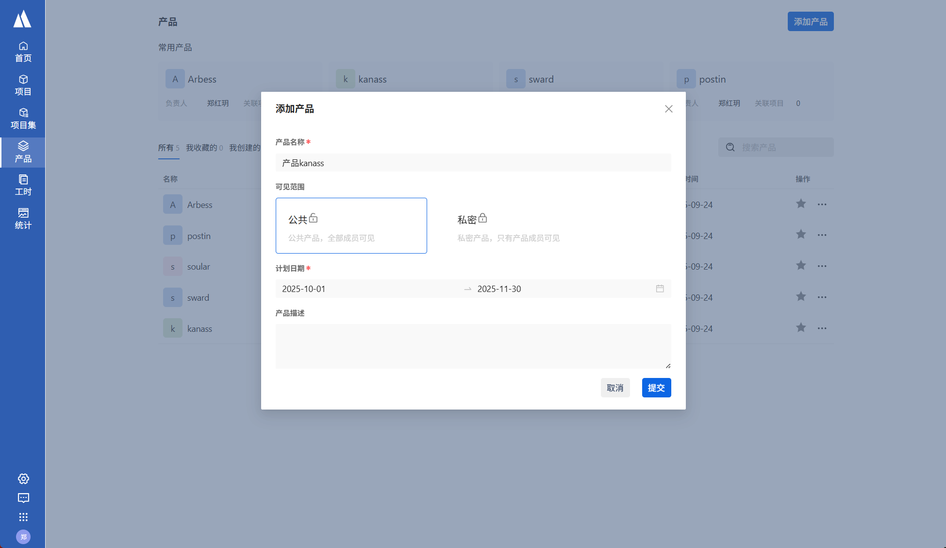 | 可见范围 | 必填 | 公共:kanass系统中的成员,都可以看见此产品 私密:只有产品中的成员,可以看见此产品 |