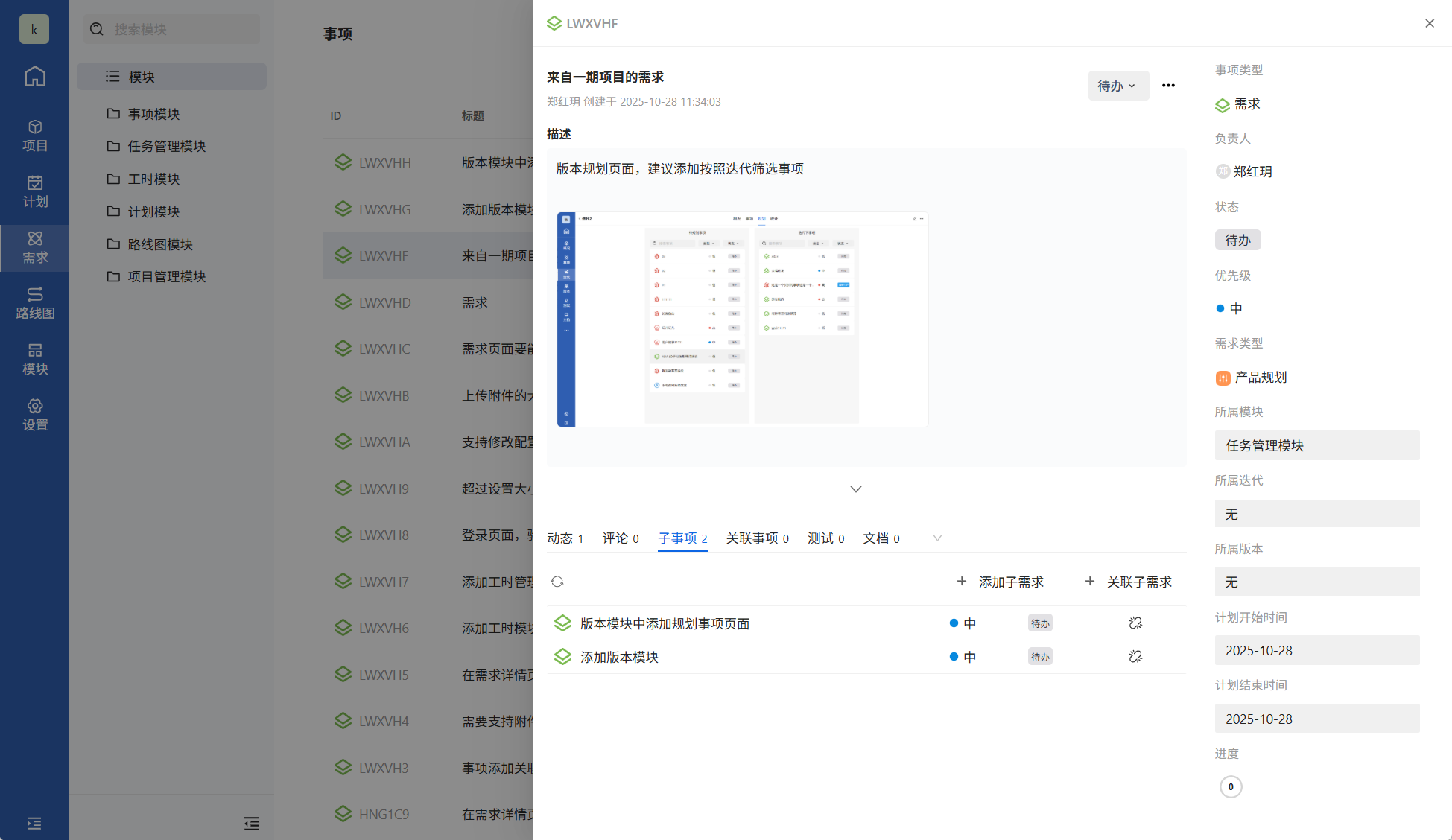 点击需求->子事项,可以添加当前需求的子需求或者关联已存在的子需求。