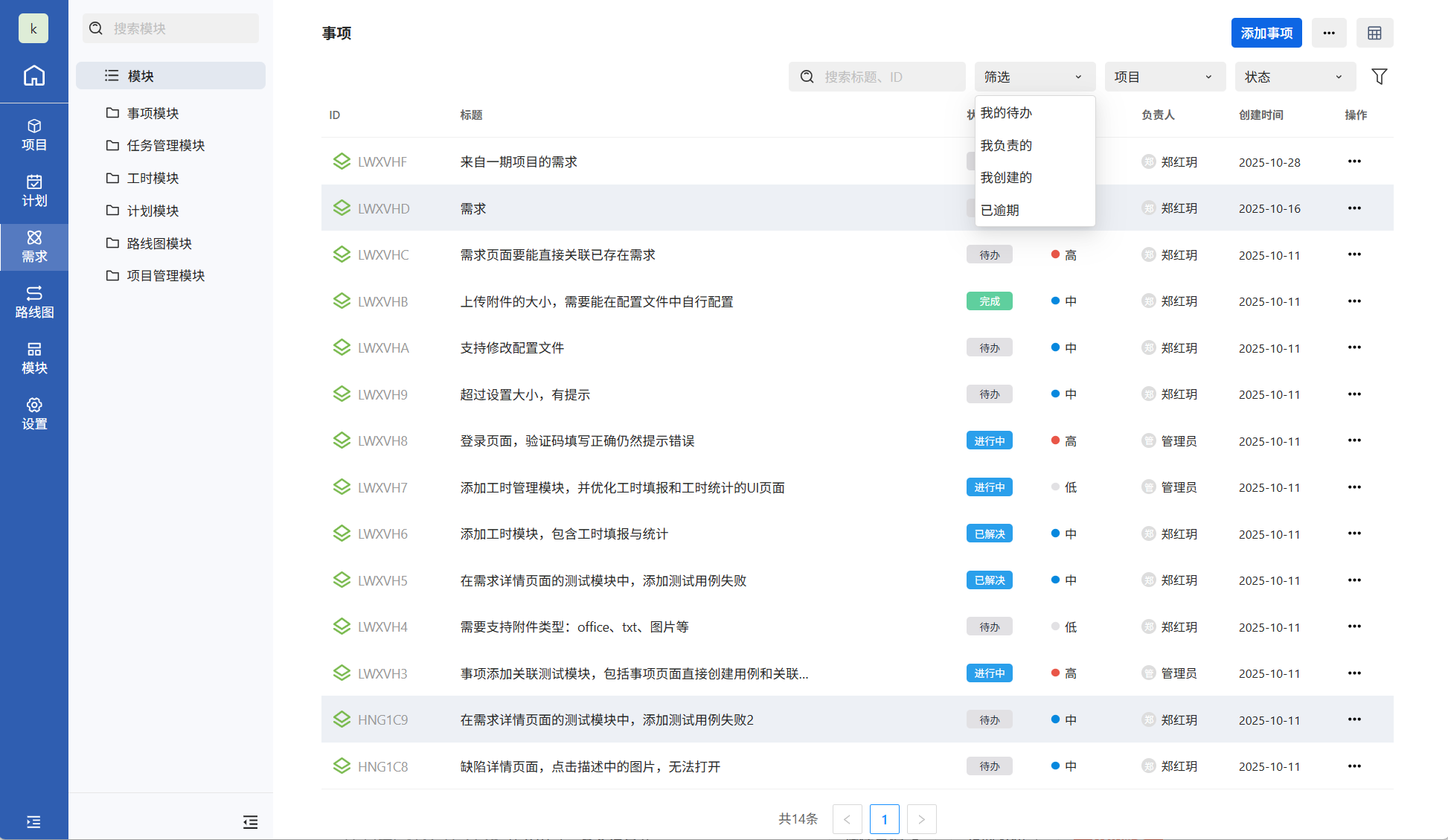 标题\ID筛选:可以通过标题或ID,来筛选需求,支持模糊查询和精准查询