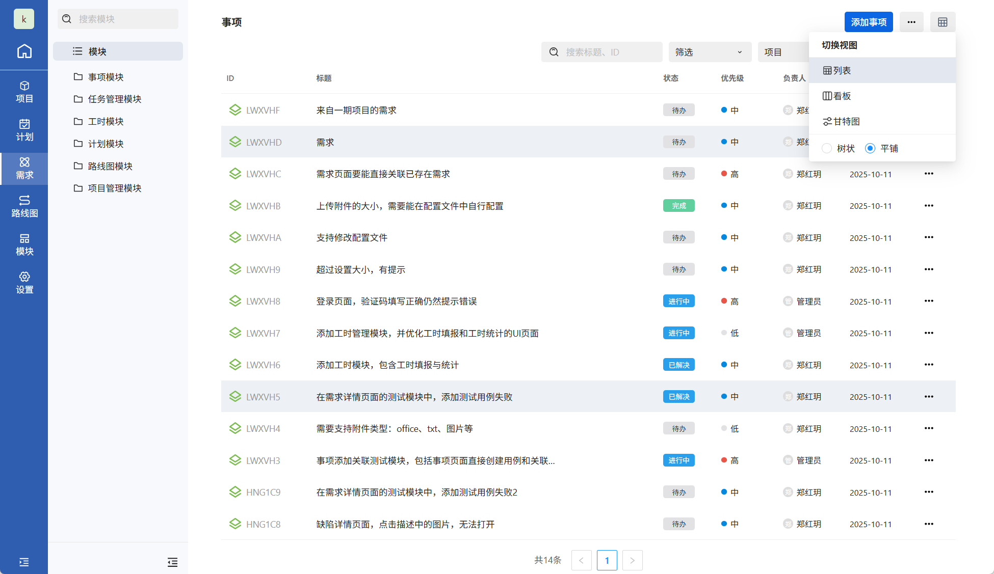 默认显示所有需求,可以通过不同的视图来展示需求,支持列表-平铺视图、列表-树状视图、看板视图、甘特图视图