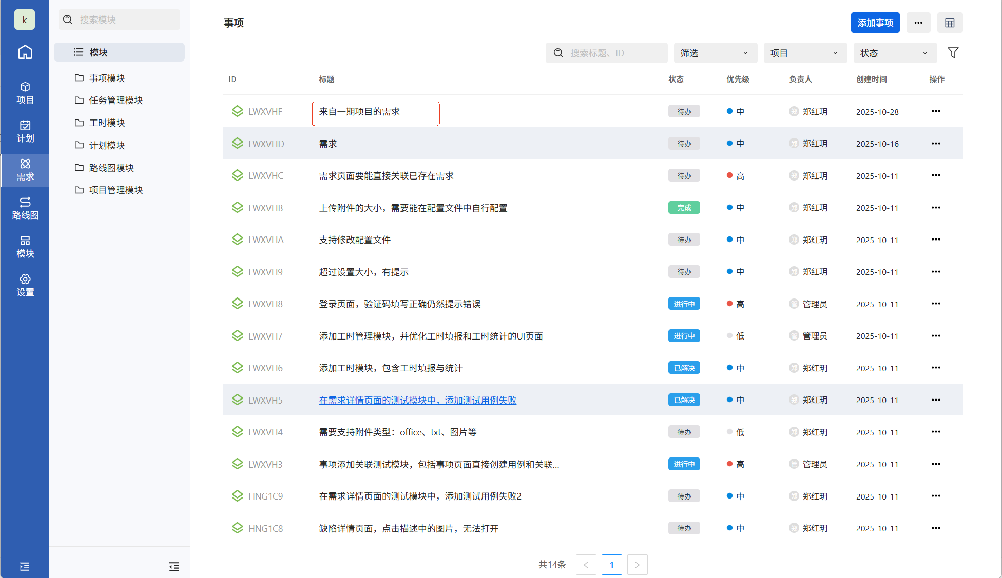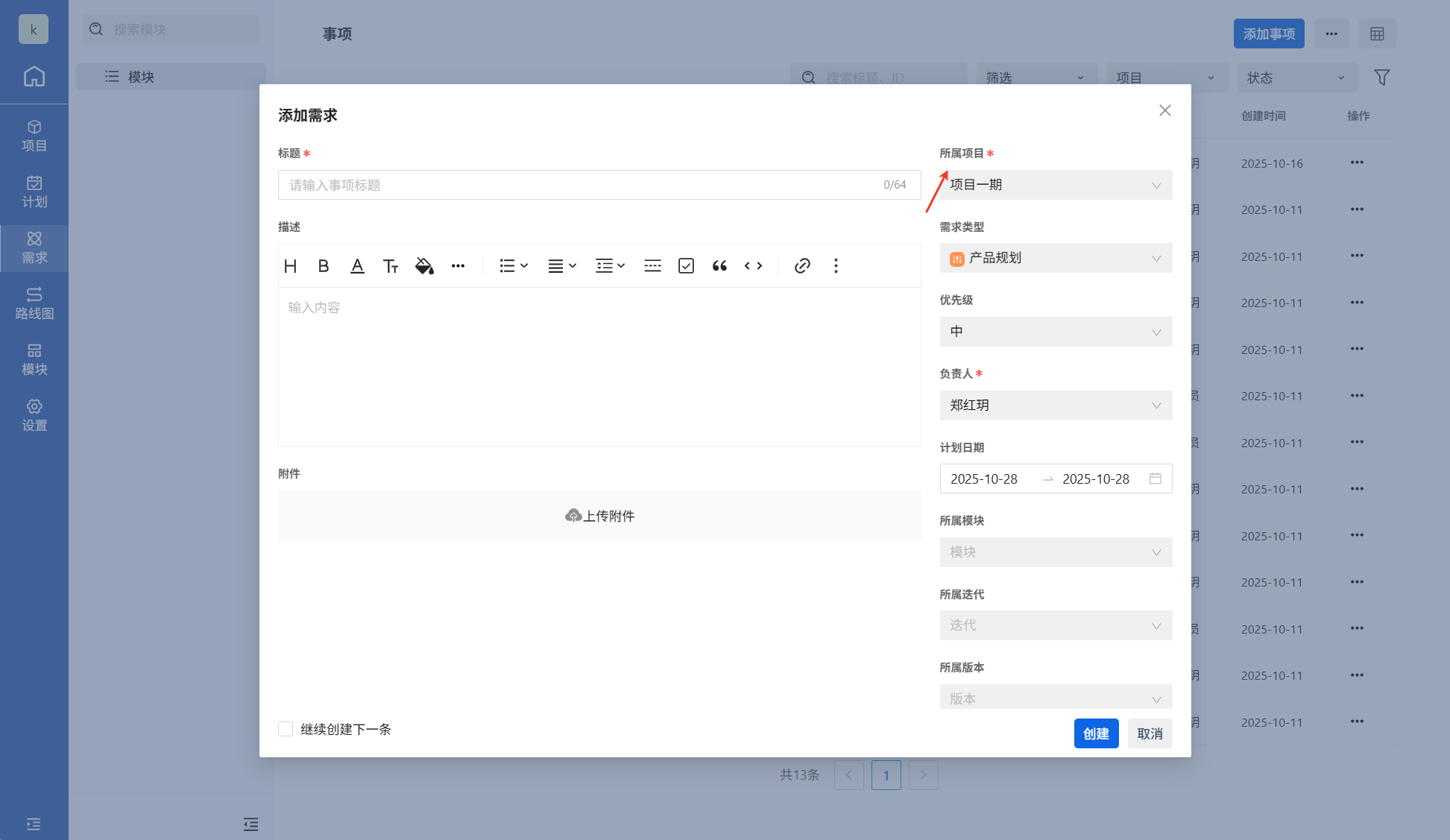 产品下的需求模块,用来添加和展示产品下的所有需求。在添加需求时,需要选择需求所在的项目。