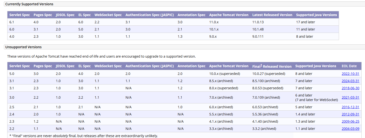 下表是选择 Tomcat 版本时最重要的参考依据: