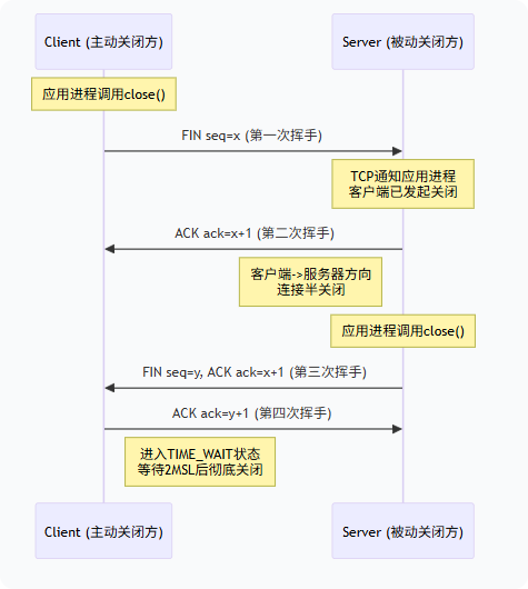 ACK:客户端收到服务器的FIN后,回复一个ACK报文段。此时,客户端会进入一个等待状态(通常是2倍的最大报文段寿命,2MSL),以确保这个ACK能到达服务器。之后,双方的所有资源都被释放。