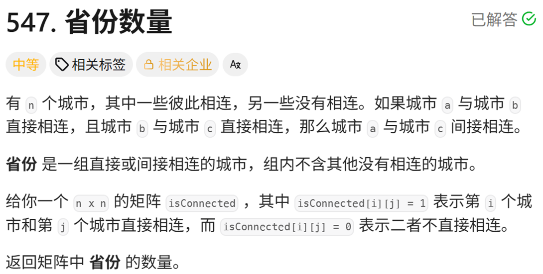 int findCircleNum(int** isConnected, int isConnectedSize, int* isConnectedColSize) {int n=isConnectedSize;LinkNode **adj=Get_Adj(isConnected,n);bool visited[n];memset(visited,false,n*sizeof(bool));int count=0;for(int i=0;i<n;i++){if(!visited[i]){count++;bfs(i,adj,visited,n);}}return count;