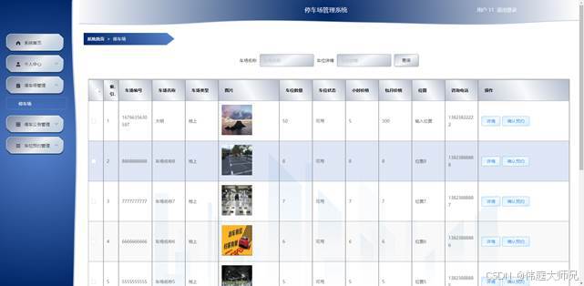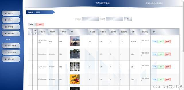 管理员点击停车场管理,在停车场管理页面对车场编号、车场名称、车场类型、图片、车位数量、车位状态、小时价格、包月价格、位置、咨询电话等信息,可以查询,新增或删除停车场信息等操作。如图5-4所示: