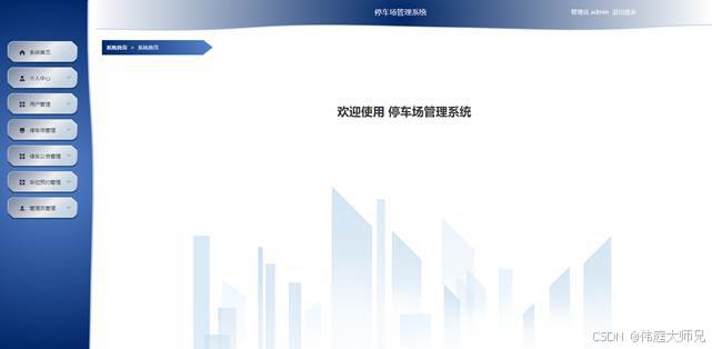 管理员进入系统主页面,主要功能包括对系统首页、个人中心、用户管理、停车场管理、停车公告管理、车位预约管理、管理员管理等进行操作。管理员主页面如图5-2所示: