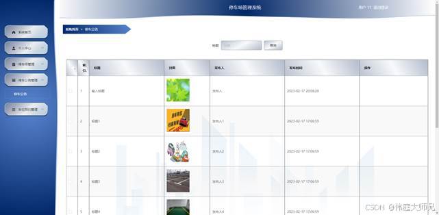 用户点击停车公告管理,在停车公告管理页面对标题、封面、发布人、发布时间等信息,可以查询或删除停车公告等操作。如图5-12所示:
