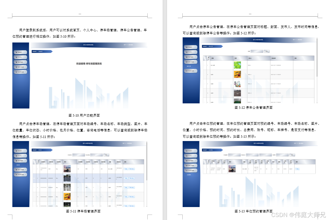 用户登录到系统后,用户可以对系统首页、个人中心、停车场管理、停车公告管理、车位预约管理进行相应操作,如图5-10所示: