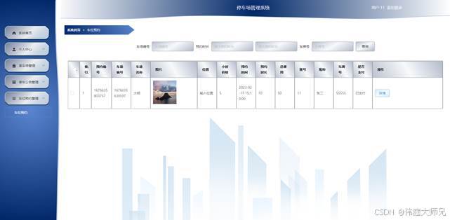 用户点击车位预约管理,在车位预约管理页面对预约编号、车场编号、车场名称、图片、位置、小时价格、预约时间、预约时长、总费用、账号、昵称、车牌号、是否支付等信息,可以查询或删除车位预约等操作。如图5-13所示: