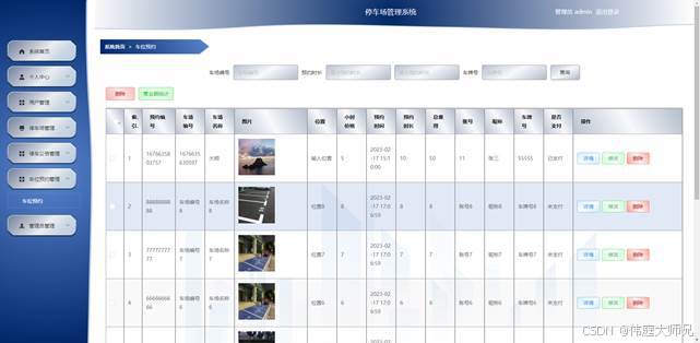管理员点击车位预约管理,在车位预约管理页面对预约编号、车场编号、车场名称、图片、位置、小时价格、预约时间、预约时长、总费用、账号、昵称、车牌号、是否支付等信息,可以查询或删除车位预约等操作。如图5-6所示: