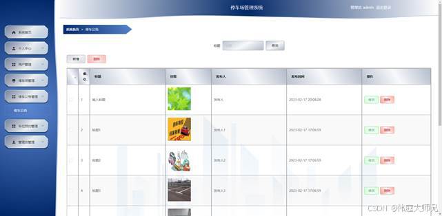 管理员点击停车公告管理,在停车公告管理页面对标题、封面、发布人、发布时间等信息,可以查询或者新增、删除停车公告等操作。如图5-5所示: