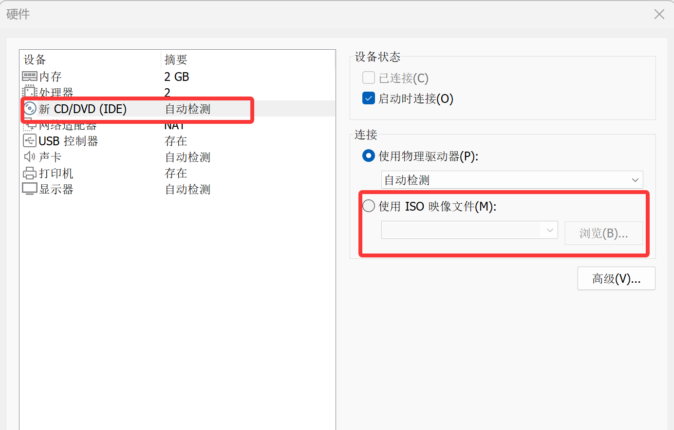 随后自定义硬件--->映像文件,找到我们下载的centOS7.iso文件