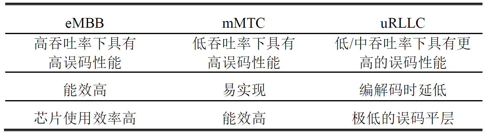 在5G 标准中,三大应用场景对信道编码有着各异的需求,关键需求如下表所示: