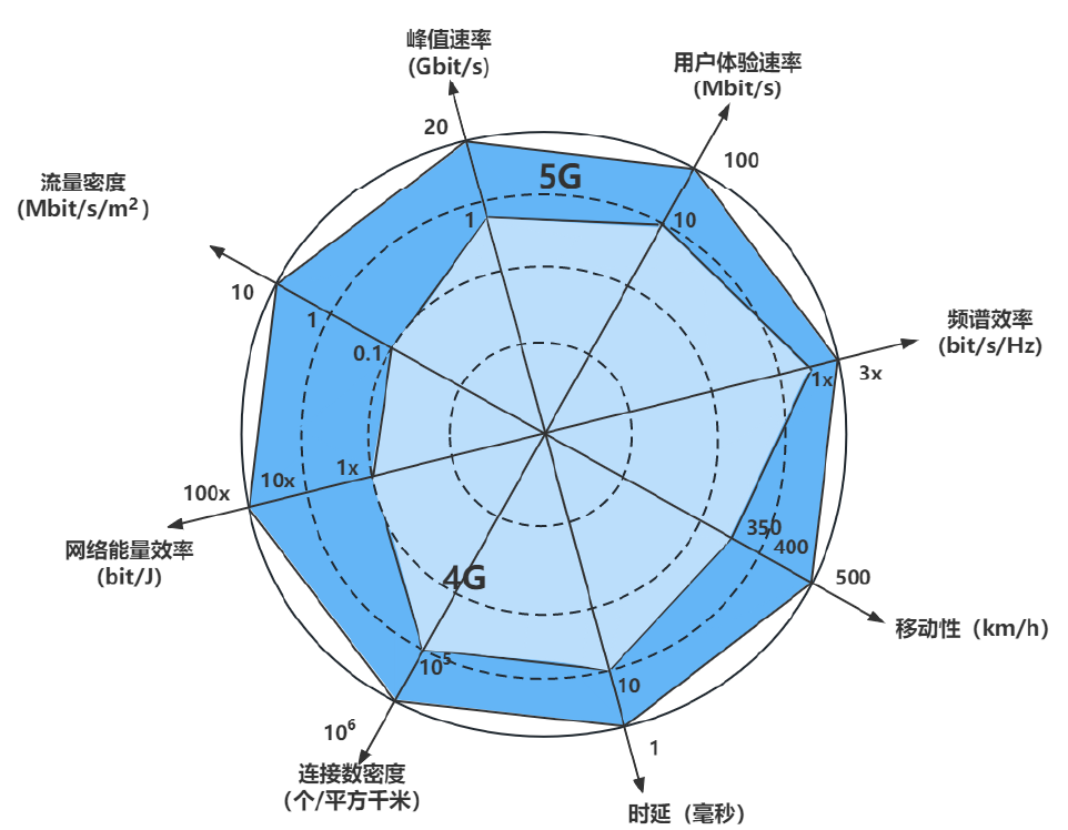 这些关键性能指标相较于4G标准有大幅度提升,如用户体验速率达到100Mbit/s~1Gbit/s,用来满足极致的业务体验;传输时延控制在毫秒量级,用以满足工业控制和自动驾驶等对时延要求敏感的场景;用户终端的移动速度可以支持到500km/h,多普勒效应显著降低,使得用户在高速环境下仍然有较佳的体验;连接数密度最高可达10Mbit/(s.m2),可以支持海量设备之间相互连接。5G 的8 大关键性能指标如下图所示。
