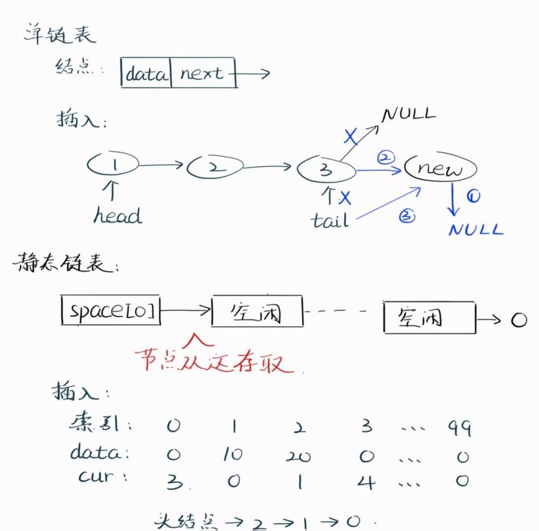 }4. 在一些不设“指针”类型的高级语言中,比如Java,我们可以使用静态链表。就是开设一个一维数组,数组的零号位视为头结点,这里的头结点定义为其next指向第一个结点。