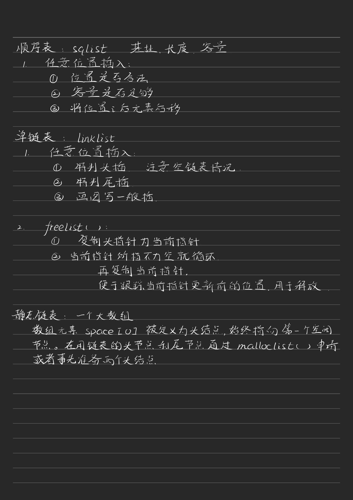 {if(i < 1 || i > getLength(space) + 1) {printf("插入位置无效\n");return;}int k = mallocList(space);if(k == 0) {printf("空间已满,无法插入\n");return;}space[k].data = e;// 找到插入位置的前一个节点int j = 0; // 数据链表头for(int l = 1; l < i; l++) {j = space[j].cur;}// 插入节点space[k].cur = space[j].cur;space[j].cur = k;