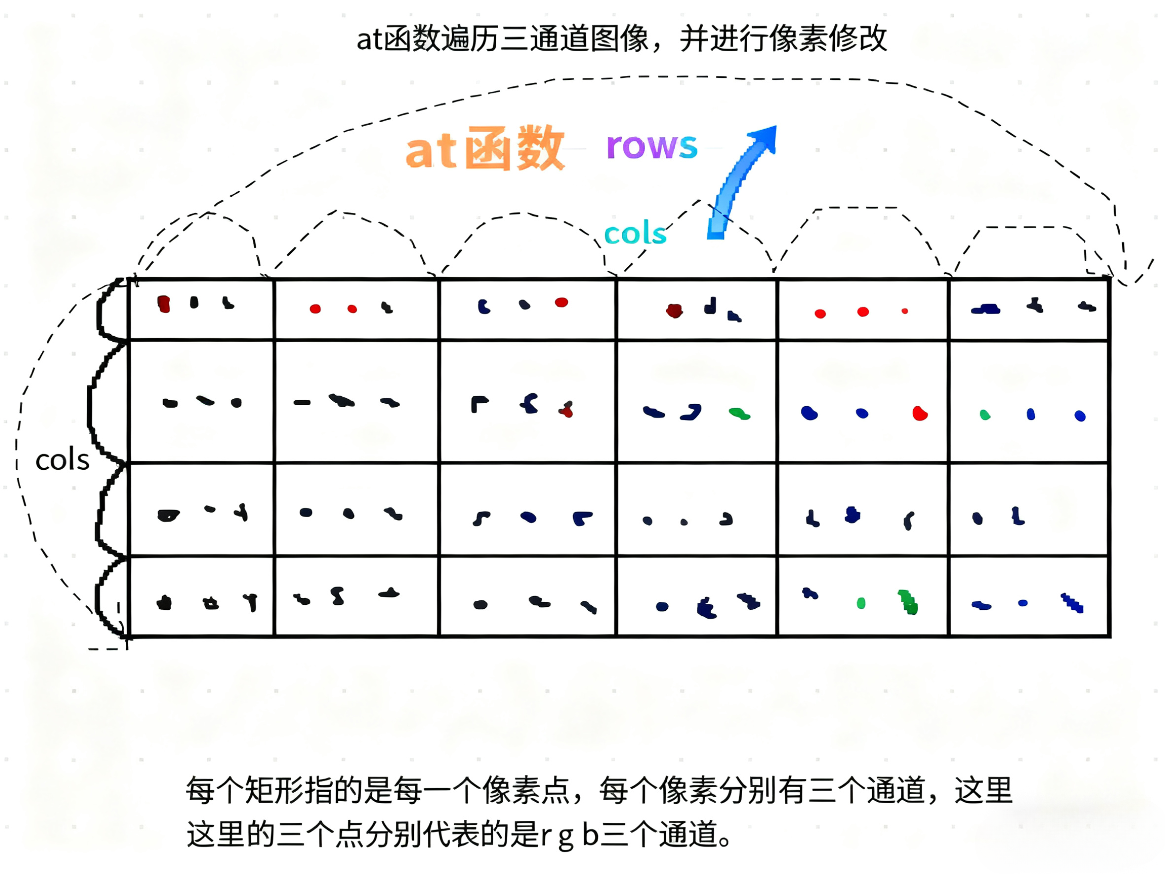 AT函数是OPENCV中重要的函数之一,它的作用是修改Mat的矩阵某个像素值。换言之,我们需要修改图像中的像素点就需要利用AT函数去获取并且修改,AT函数的修改一般需要循环cols和rows然后对每个像素点进行修改,如上图。AT函数的定义如下:
