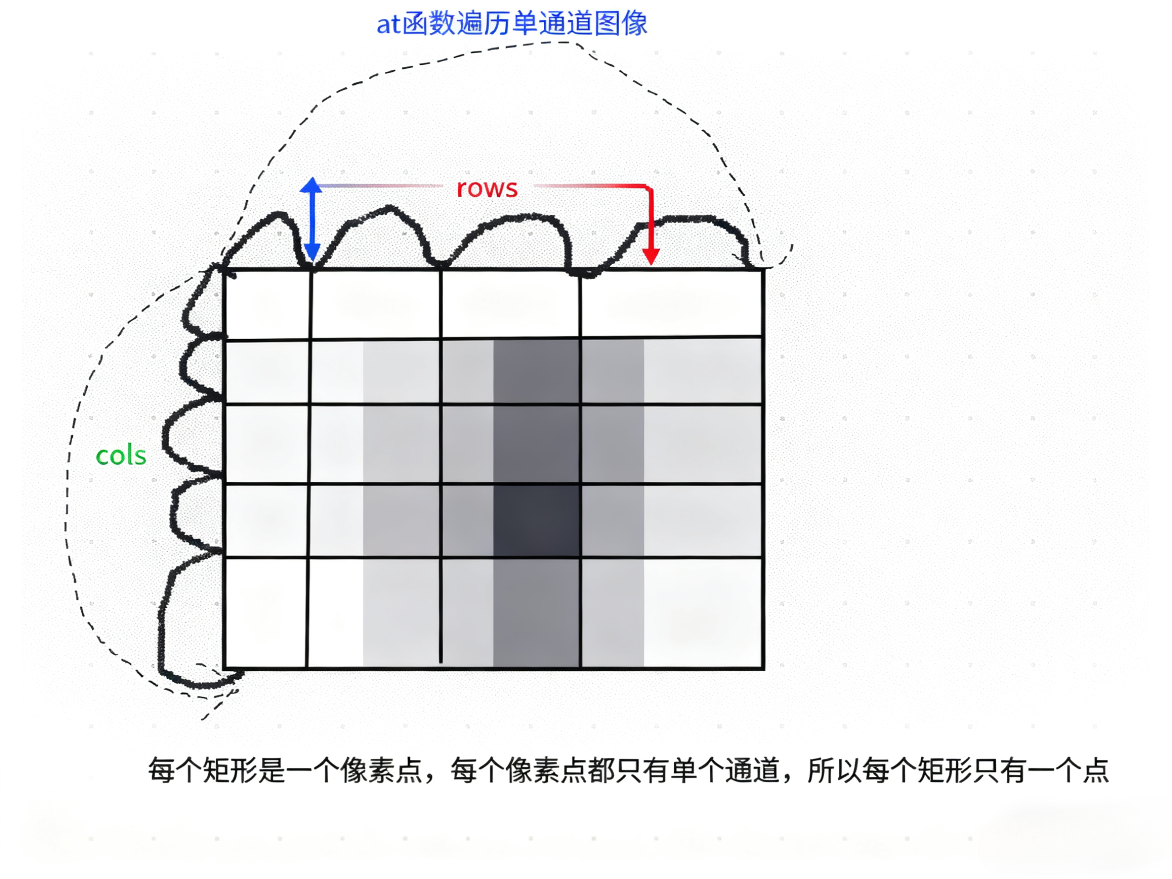 2.2. 本章节代码主要是实现对一个Mat矩阵用at函数去遍历cols和rows,并修改单通道像素,大概的代码如下: