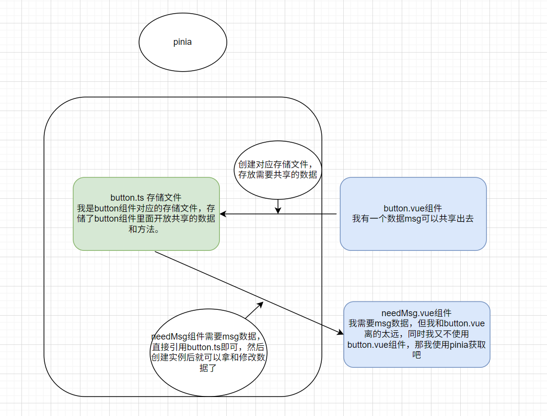 pinia的基本使用流程:对于每一个用到了共享数据的.vue组件,就创建一个对应的存储文件到src/store目录下,如 button.vue组件定义了共享的数据 btnMsg ,其它组件要想使用就必须有一个共享的数据载体引入后再使用,因此创建一个button.ts存储文件,里面存放一些数据和方法,其它组件需要时导入即可。