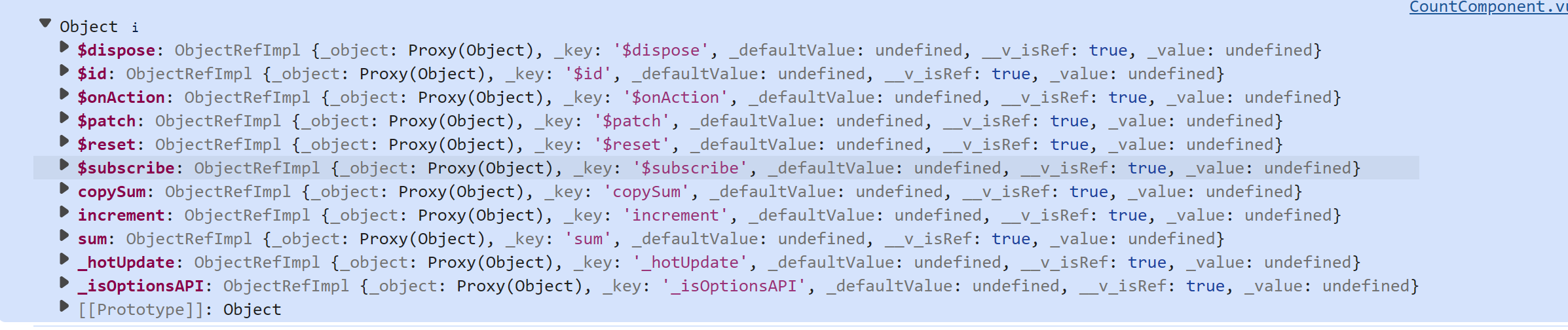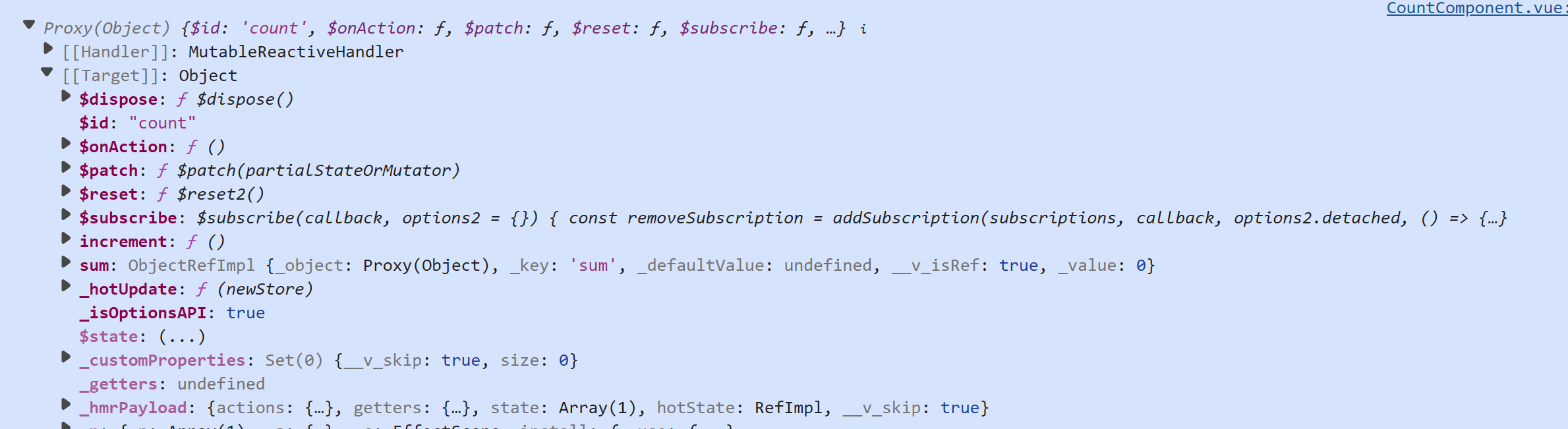 let countStore = useCountStore()输出 countStore(下面以存储对象代称) 可以看到该对象包含了 state 里面定义的数据和一些操作方法(即state\action\getters里面的东西)