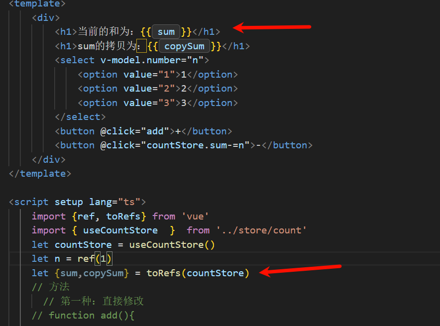 // 第二种:使用$patch修改function add(){countStore.$patch({sum: countStore.sum + n.value,copySum:countStore.sum})}即格式如下: