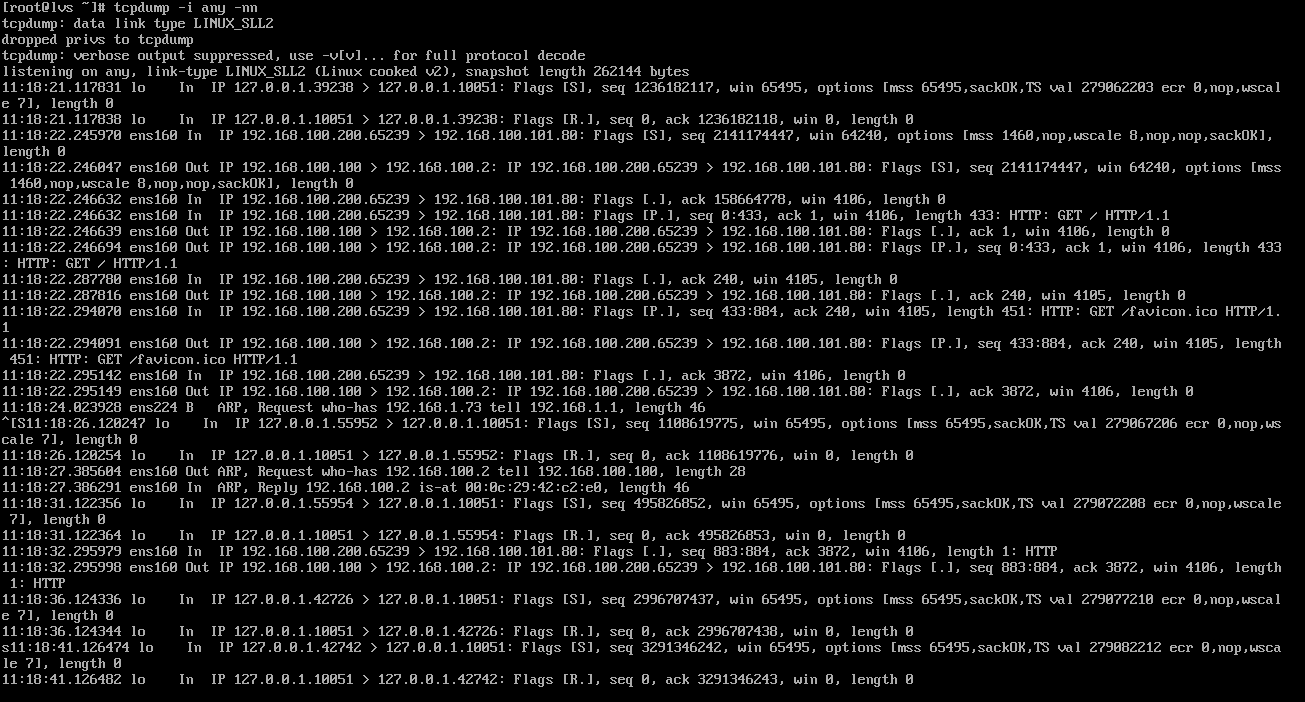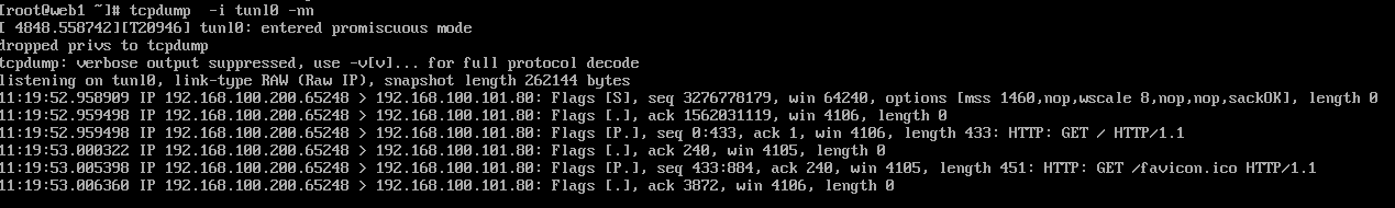 [root@web1 ~]# vim /etc/sysctl.conf net.ipv4.conf.all.arp_ignore=1 net.ipv4.conf.all.arp_announce=2 [root@web1 ~]# sysctl -p #加载隧道模块 [root@web1 ~]# modprobe ipip [root@web1 ~]# ip a #添加ip临时添加 [root@web1 ~]# ip addr add 192.168.100.101/24 dev tunl0 #网卡生效 [root@web1 ~]# ip link set up tunl0 ###删除tunl0路由 [root@web1 ~]# ip route del 192.168.100.0/24 dev tunl0