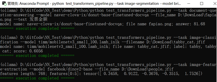 测试代码中包含的task:document-question-answering(naver-clova-ix/donut-base-finetuned-docvqa)、image-classification(timm/mobilenetv3_small_100.lamb_in1k)、image-feature-extraction(facebook/dinov2-base)、image-segmentation(briaai/RMBG-1.4)、object-detection(hustvl/yolos-small)