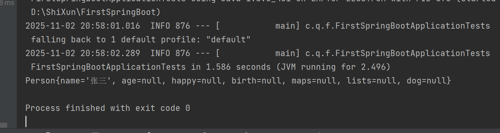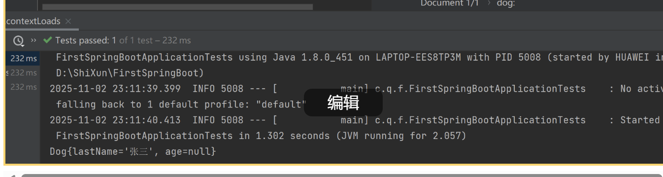 class FirstSpringBootApplicationTests {@Autowiredprivate Dog dog;@Autowiredprivate Person person;@Testvoid contextLoads() {