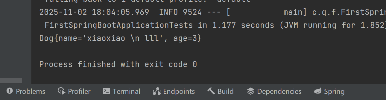 // @Value("旺财")public void setName(String name) {this.name = name;}public Integer getAge() {return age;}@Value("3")public void setAge(Integer age) {this.age = age;}public Dog() {}public Dog(String name, Integer age) {this.name = name;this.age = age;}@Overridepublic String toString() {return "Dog{" +"name='" + name + '\'' +", age=" + age +'}';}