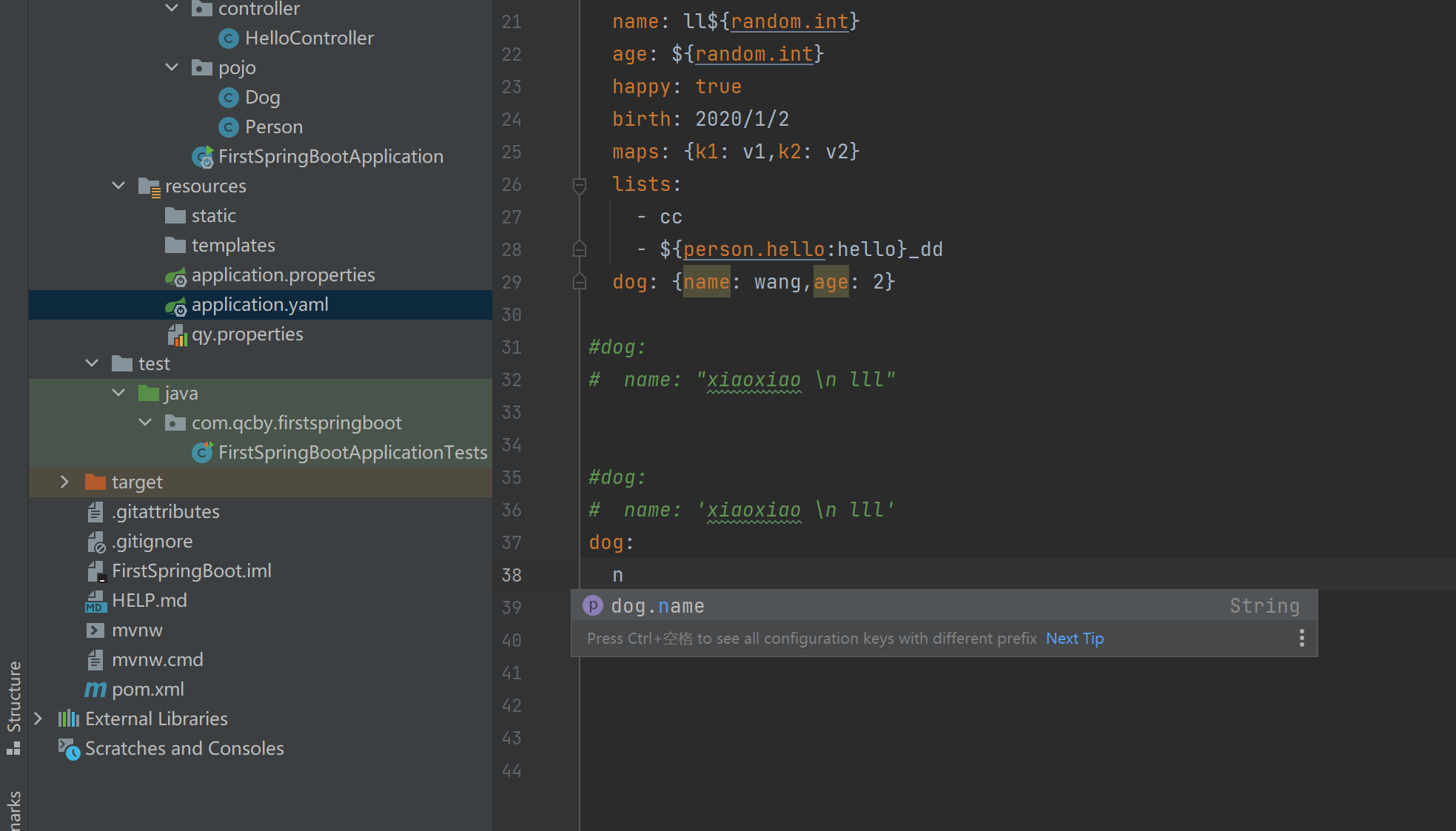 person.last‐name=张三${random.uuid} person.age=${random.int} person.birth=2017/12/15 person.boss=false person.maps.k1=v1 person.maps.k2=14 person.lists=a,b,c person.dog.name=${person.hello:hello}_dog person.dog.age=15 |