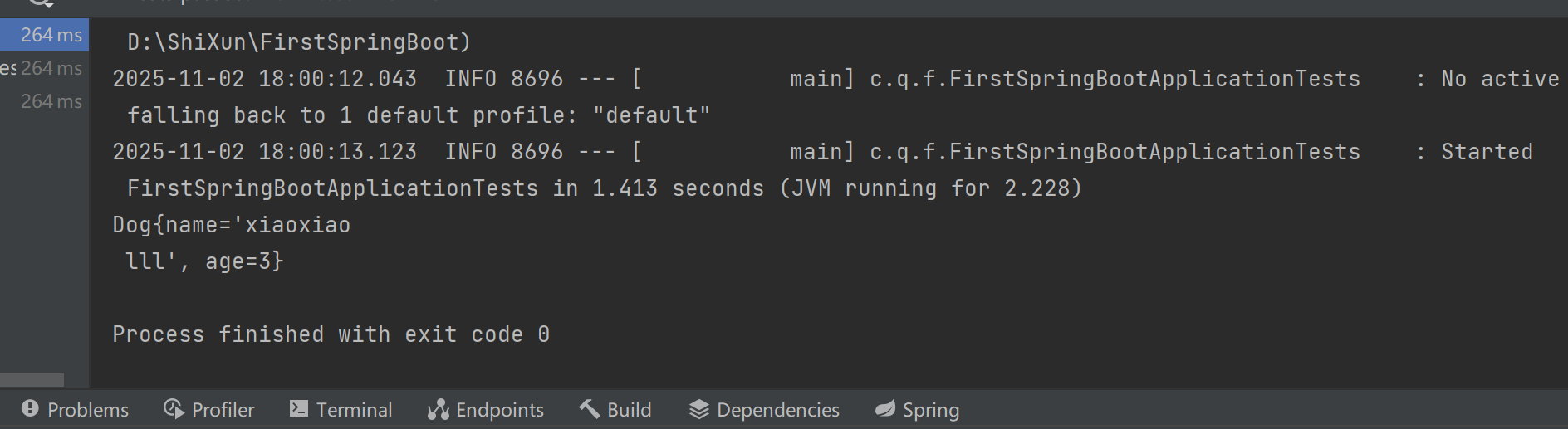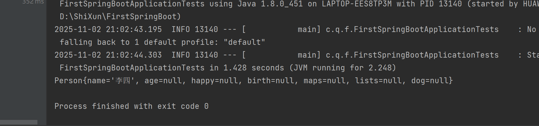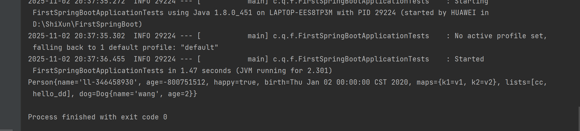 class FirstSpringBootApplicationTests {@Autowiredprivate Dog dog;@Autowiredprivate Person person;@Testvoid contextLoads() {System.out.println(dog);