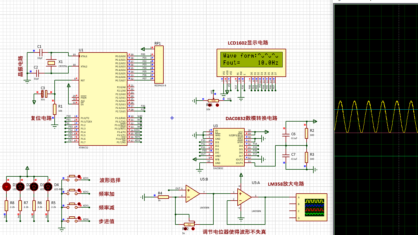 本设计以51单片机为核心,通过DAC0832数模转换器和LM358运算放大器实现正弦波、方波、三角波、锯齿波等波形的生成与输出。支持波形选择、频率调节、幅度调节及失真校正功能,并通过LCD1602显示屏实时显示波形参数。