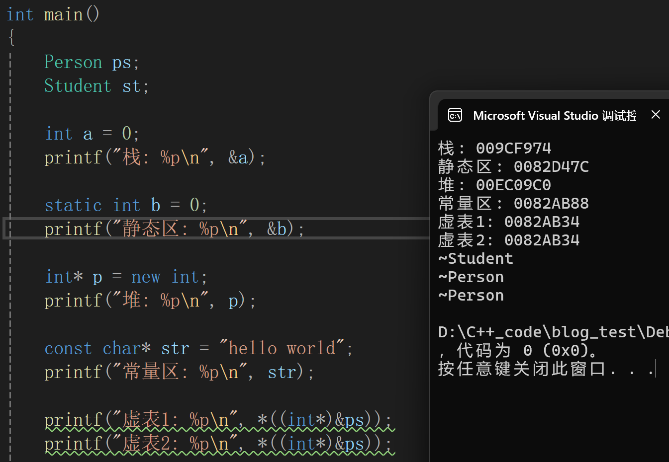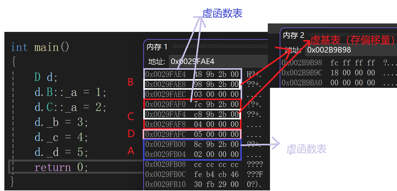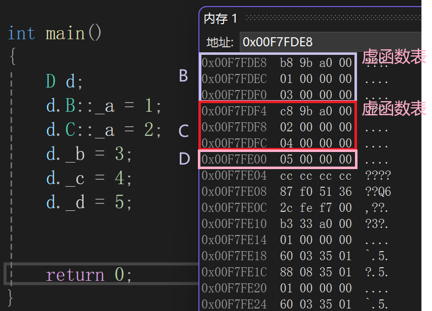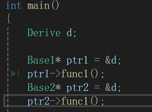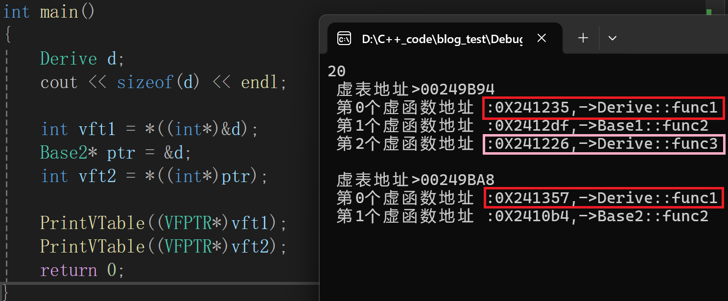 {Derive d;cout << sizeof(d) << endl;int vft1 = *((int*)&d);Base2* ptr = &d;int vft2 = *((int*)ptr);PrintVTable((VFPTR*)vft1);PrintVTable((VFPTR*)vft2);return 0;