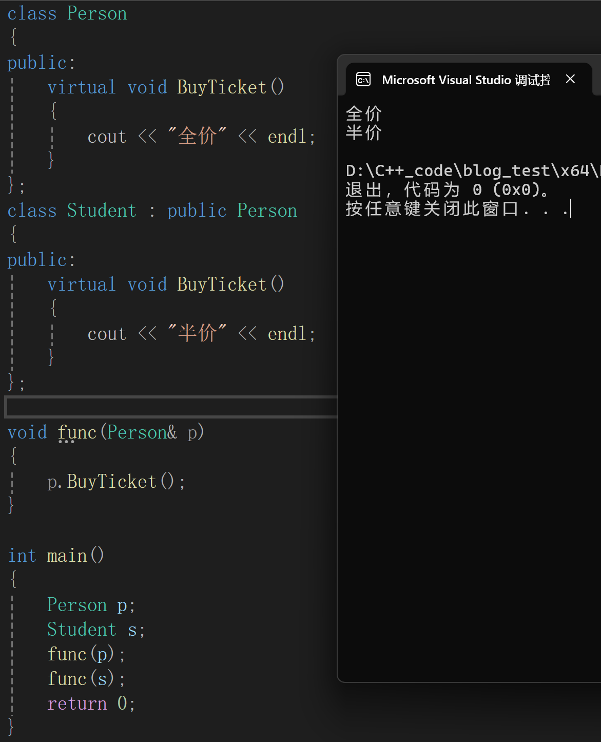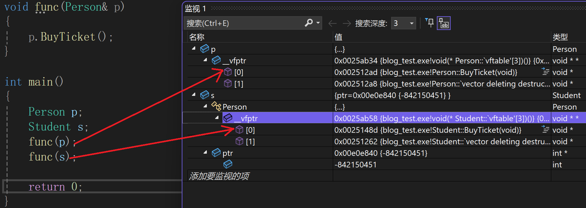 函数是Person::BuyTicket。p引用s对象时,p.BuyTicket在s的虚表中找到虚函数是Student::BuyTicket。