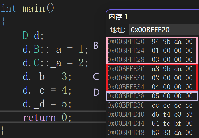 {D d;d.B::_a = 1;d.C::_a = 2;d._b = 3;d._c = 4;d._d = 5;return 0;