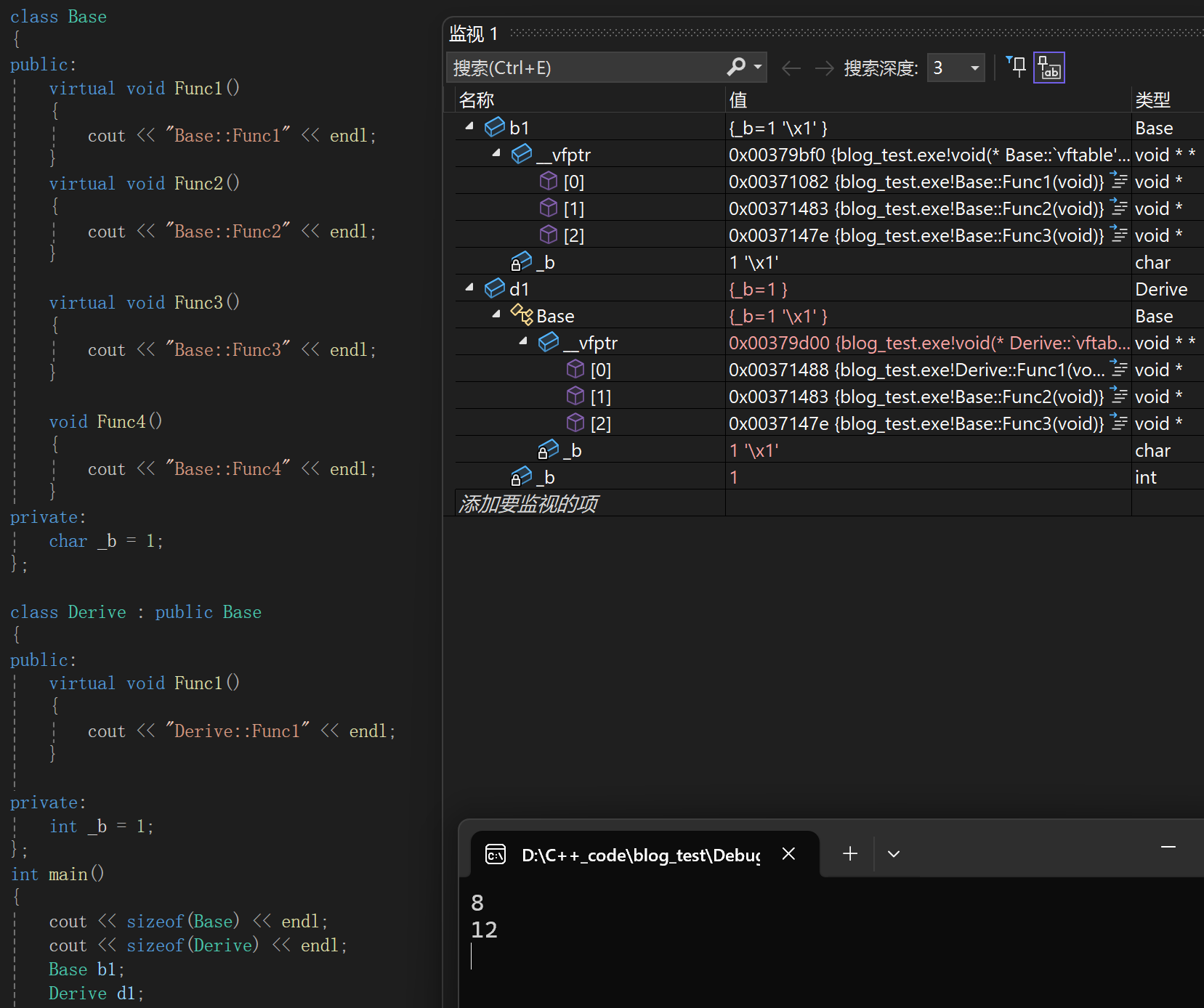 public:virtual void func1(){cout << "::func1" << endl;}virtual void func3(){cout << "D::func1" << endl;}int _d;