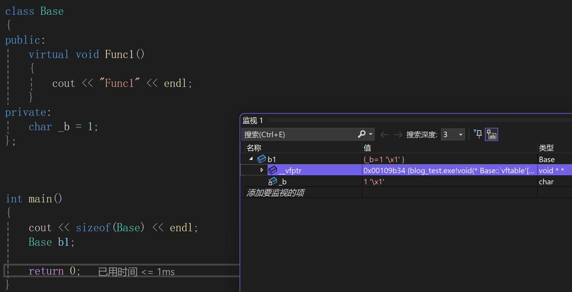 public:virtual void func1(){cout << "A::func1" << endl;}int _a;