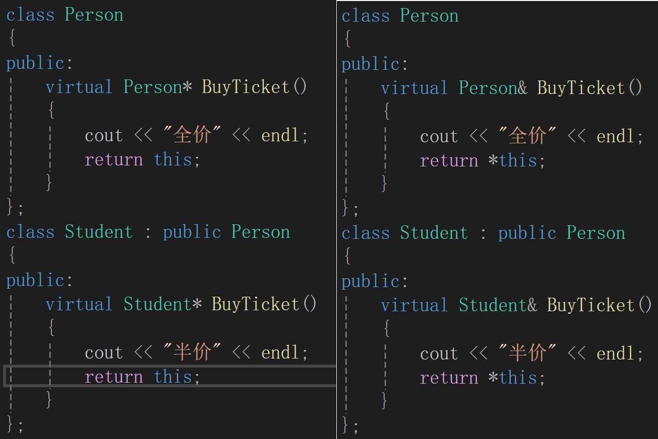 - 协变(基类与派生类虚函数返回值类型不同),返回的值可以不同,但是要求返回值必须是父子关系指针或引用