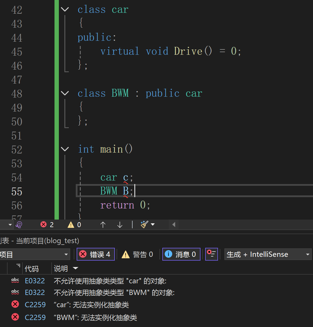 类),抽象类不能实例化出对象。派生类继承后也不能实例化出对象,只有重写纯虚函数,派生
