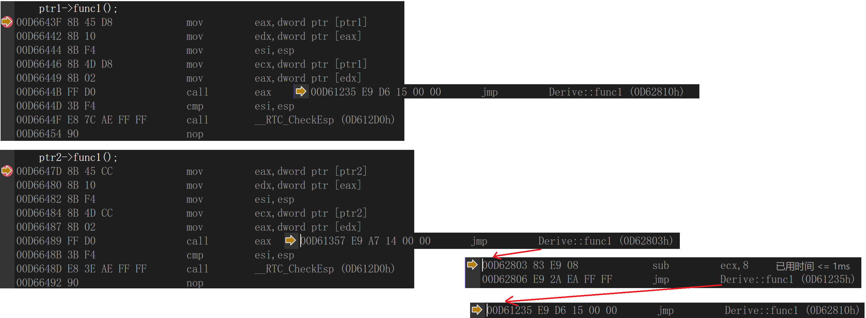 上图中的Derive::func2两个地址不一样,但却调用的同一个函数(两个红色框选)
