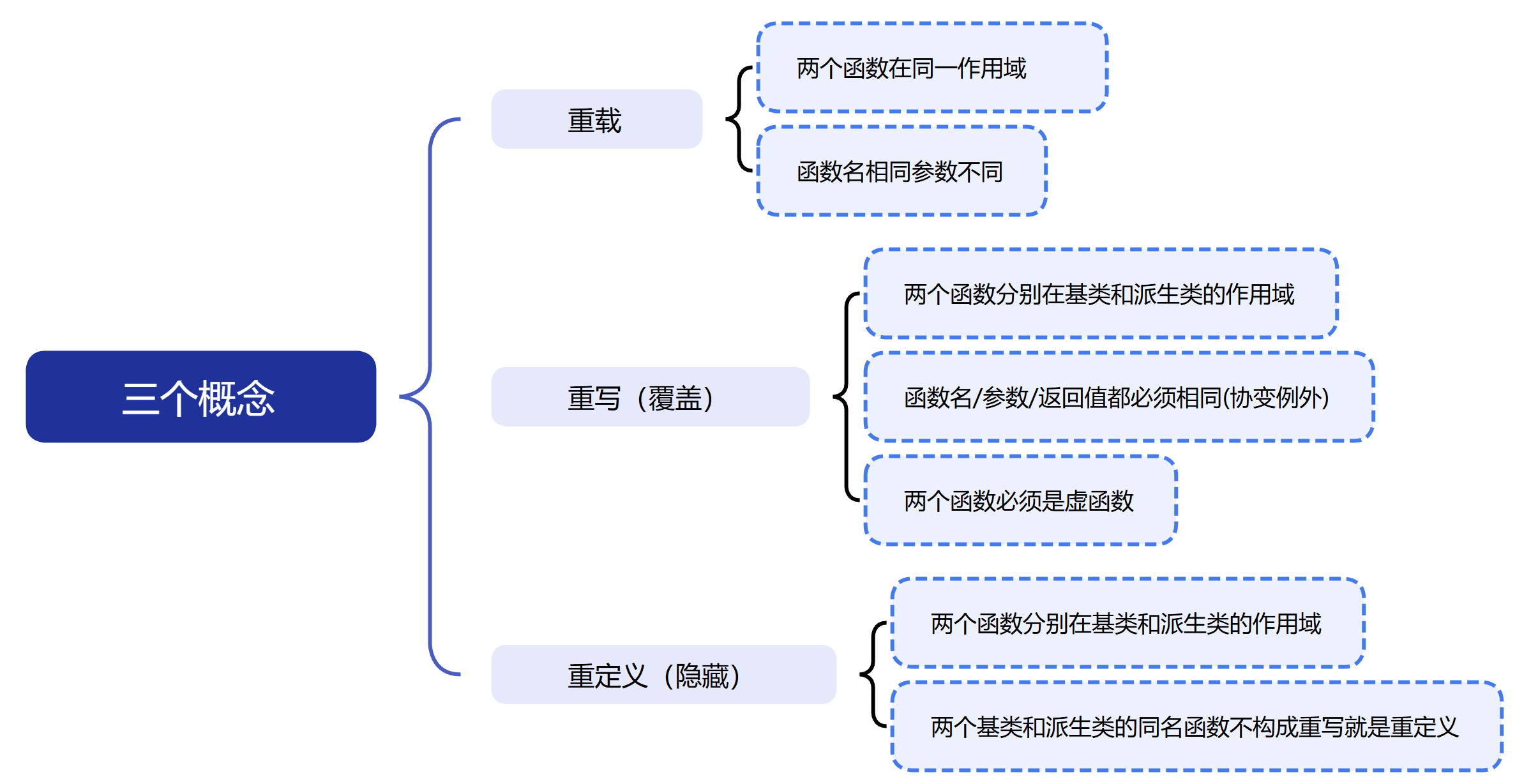 虚函数的重写(覆盖):派生类中有一个跟基类完全相同的虚函数(即派生类虚函数与基类虚函数的返回值类型、函数名字、参数列表完全相同)(三同),称子类的虚函数重写了基类的虚函数。
