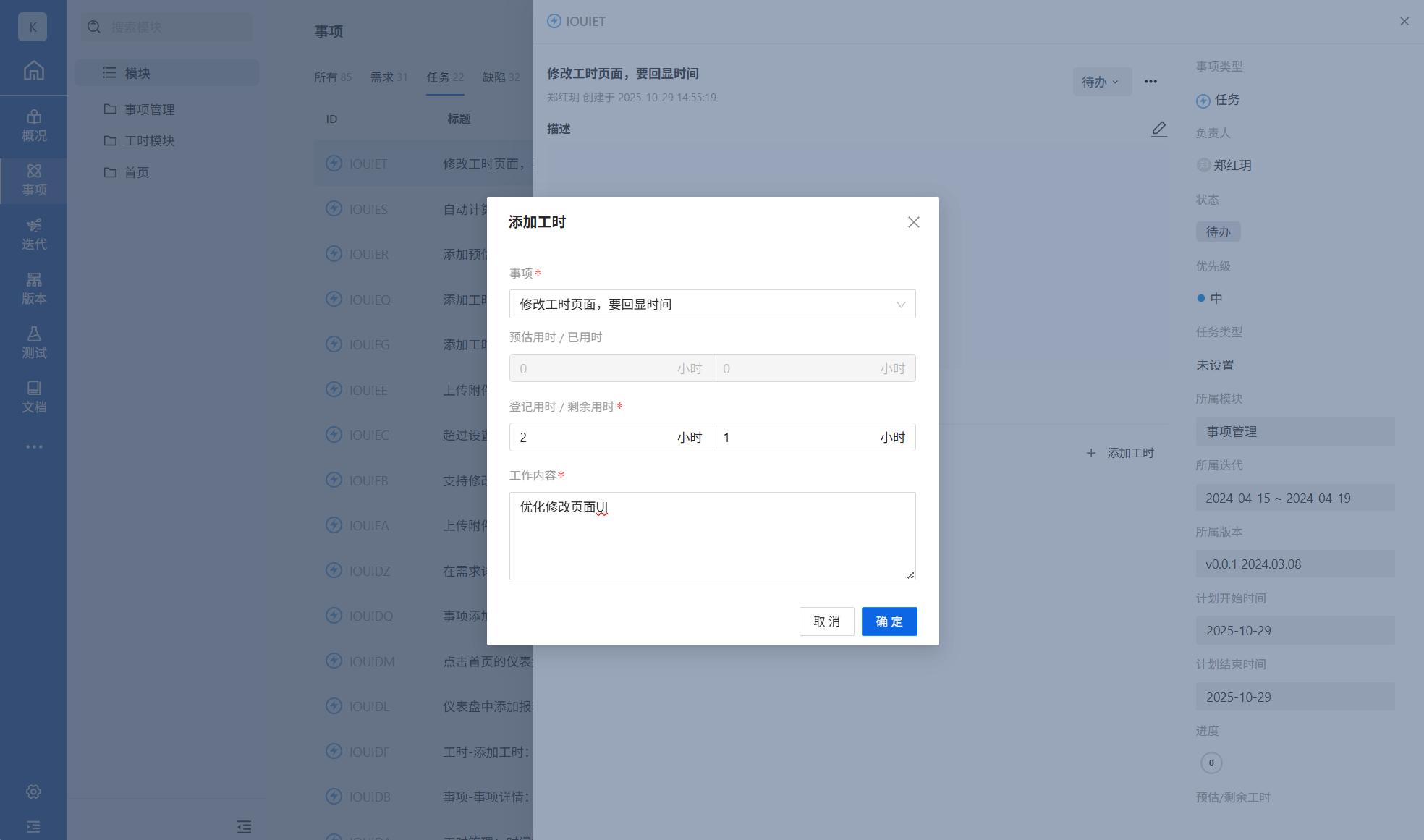 进入项目->事项->事项详情->工时,点击添加工时可以为当前事项添加工时