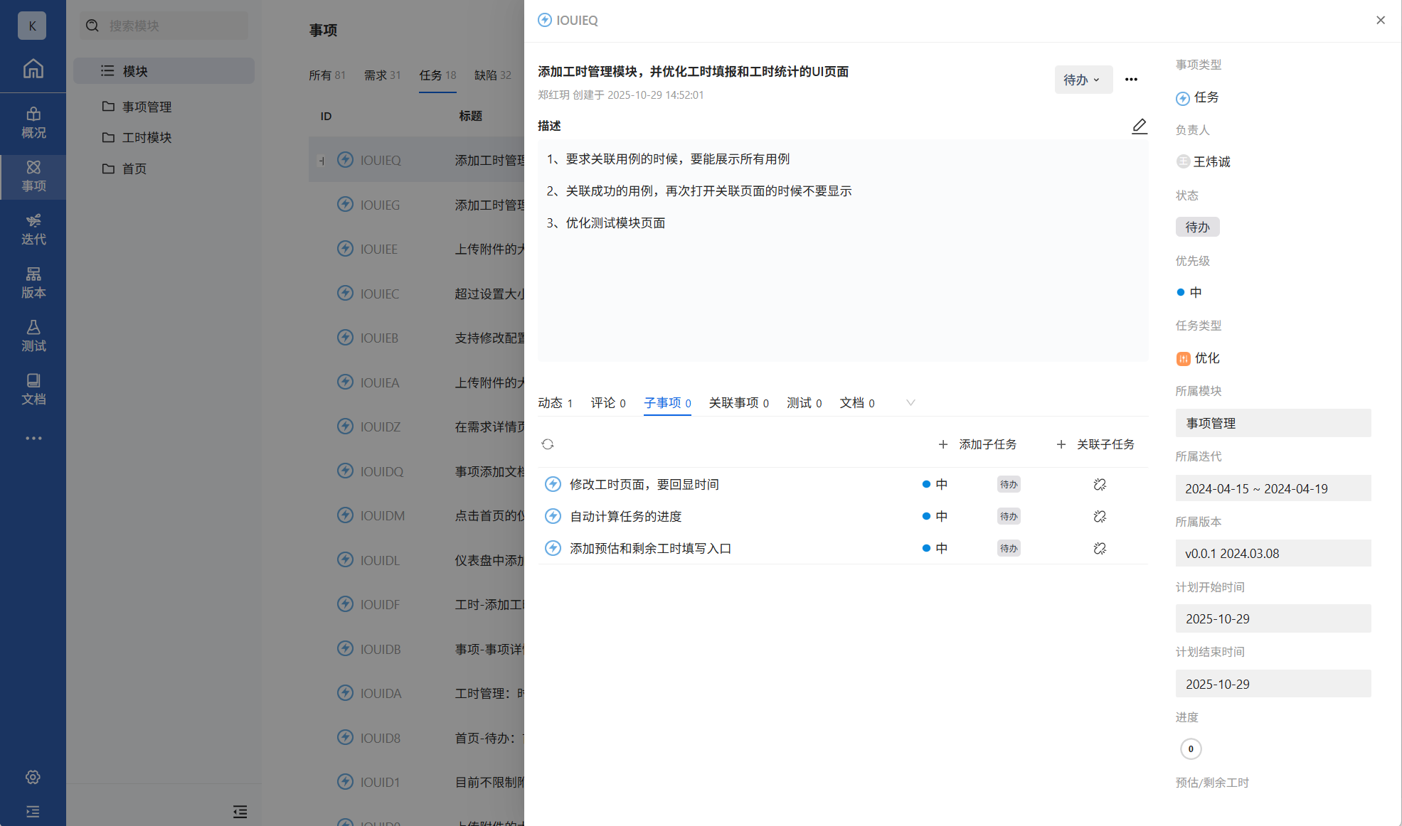 产品经理录入需求并完成需求拆分之后,会召开需求会议,对需求进行评审。评审通过后,会根据需求创建任务。或者在开发过程中,开发负责人也会创建一些与研发有关的其他任务。