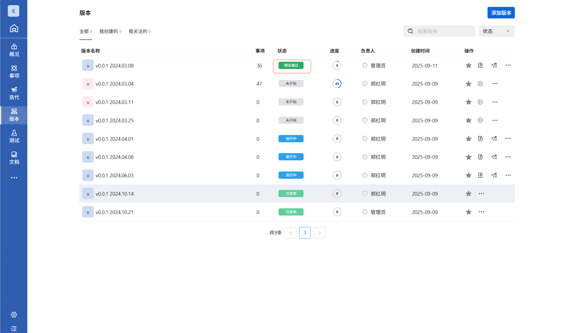 版本创建并规划成功后,点击开始版本,开发人员完成或修复该版本中的事项。所有事项完成后,既可以点击版本提测,此时会要求创建一个属于当前版本的测试计划。