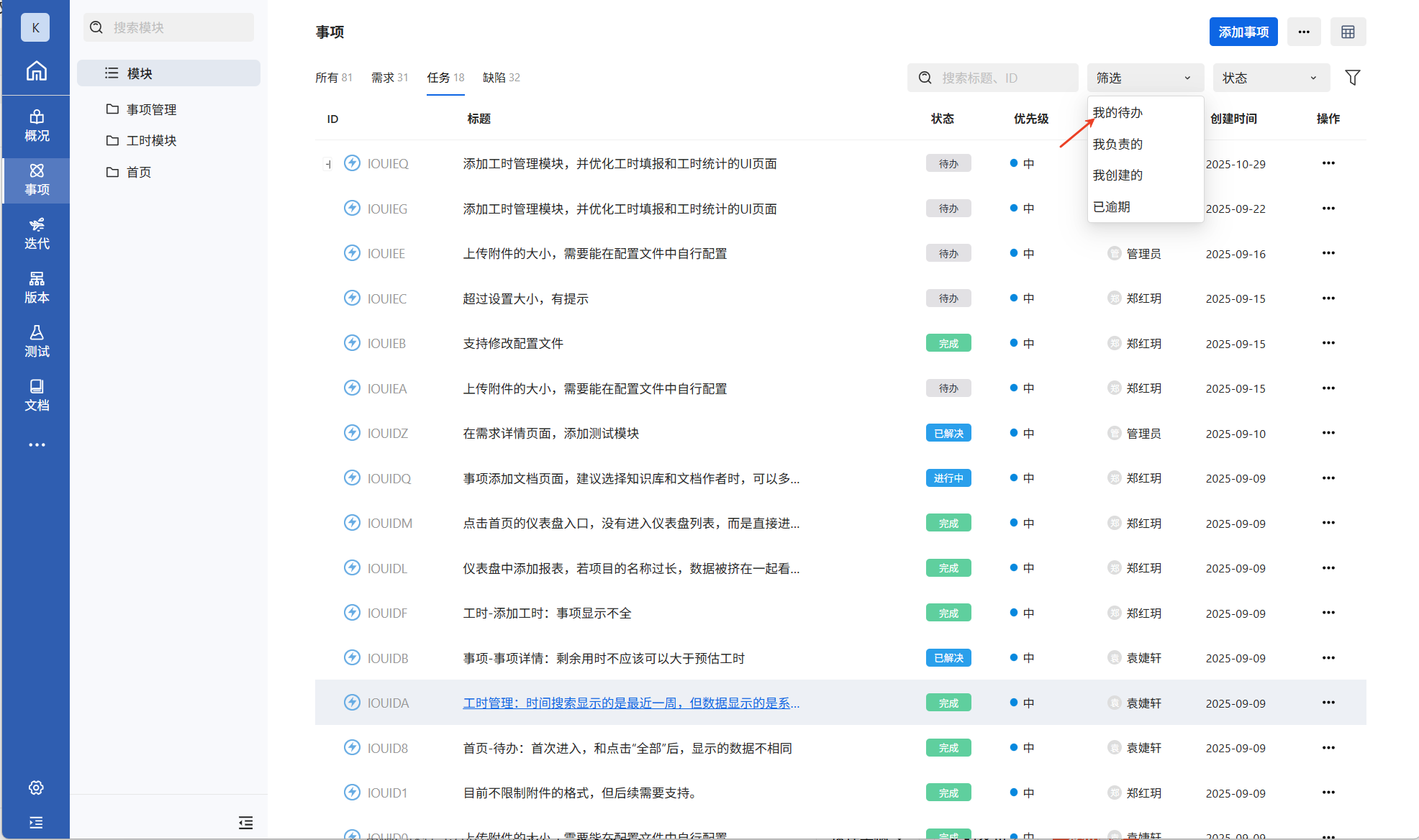 开发人员登录后,可以通过事项列表的快捷筛选,筛选出自己的待办任务。