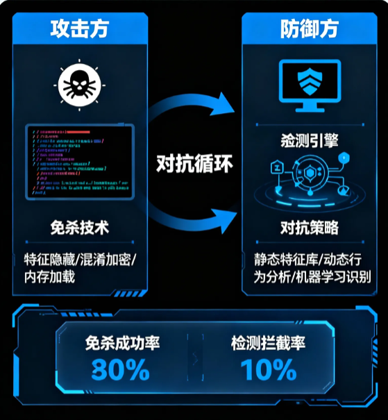 防御方:依赖杀毒软件、EDR(终端检测响应系统)、IDS/IPS 等安全设备,通过特征库、行为监控、机器学习来识别恶意程序。