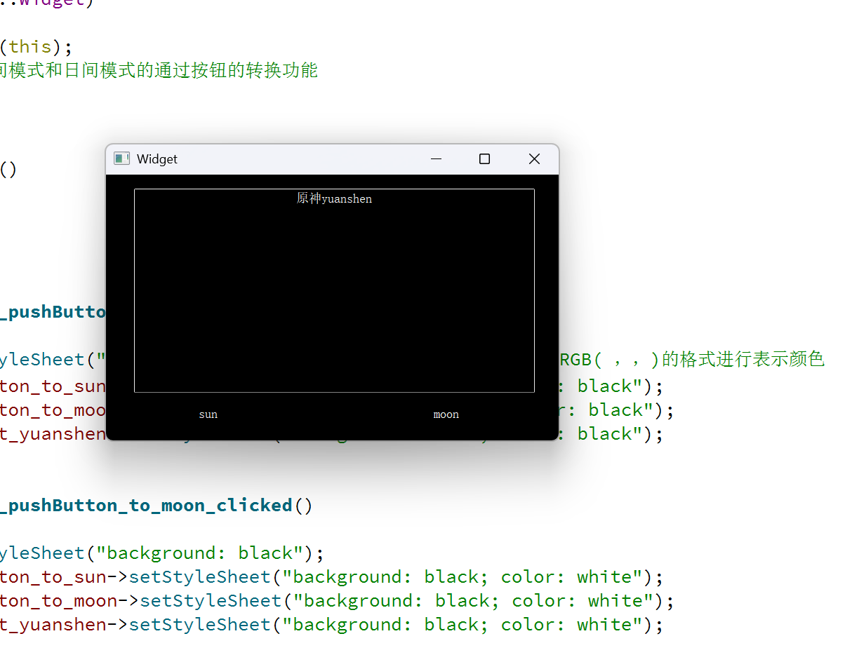 {this->setStyleSheet("background: black");ui->pushButton_to_sun->setStyleSheet("background: black; color: white");ui->pushButton_to_moon->setStyleSheet("background: black; color: white");ui->textEdit_yuanshen->setStyleSheet("background: black; color: white");